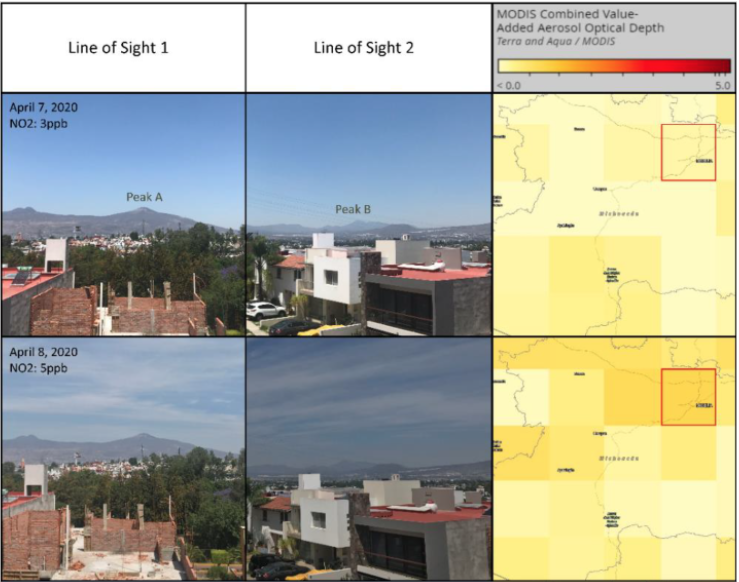 The objective of the LBA in this class is to compare different types of environmental observations and their suitability for addressing specific environmental problems. Students are tasked with designing an observing strategy for recording measurements of visibility along multiple sightlines in their city using cameras/phones. They then compare their visibility measurements to both local measures of pollution as well as observations of pollution from satellite instruments. This requires them to apply their understanding of atmospheric chemistry, dynamics, and remote sensing. An example of this is an examination of pollution evolution in a student’s hometown during Spring 2020 — in the figure below, the student has compared photographs they took with data visualization of air pollution data from the NASA MODIS satellite; this brings home what the abstracted data look like in terms of everyday life.